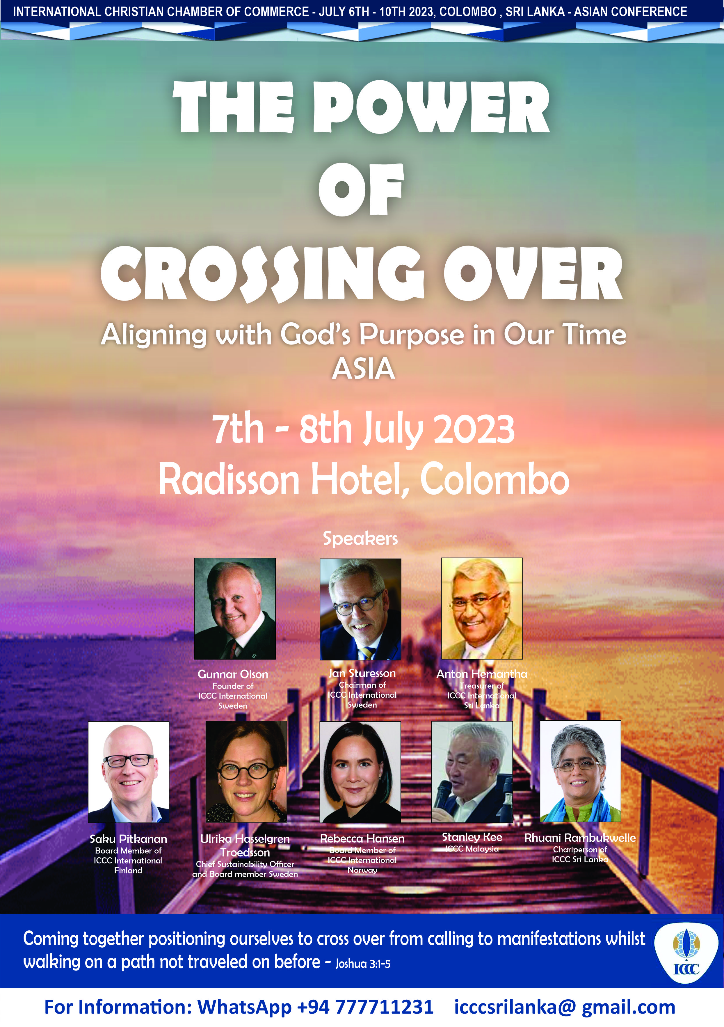 - ICCC International Regional Conference Asia 2023 - YOU are invited! For full information, please access full conference broschure via this link: "The Power of Crossing Over; Aligning With God's Purpose in Our Time" For full conference brochure - click here. PLEASE NOTE CHANGE OF VENUE! (No longer at resort Cinnamon Lakeside as stated in brochure, but Radisson Hotel Colombo)